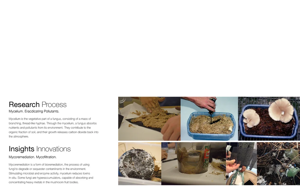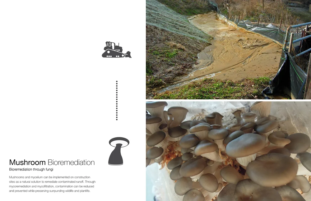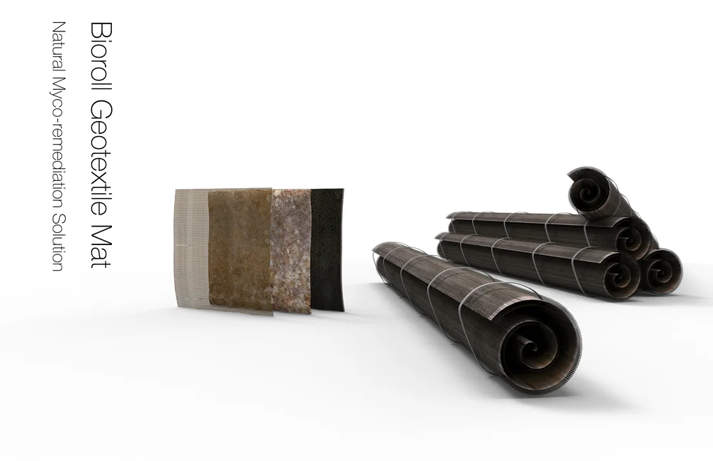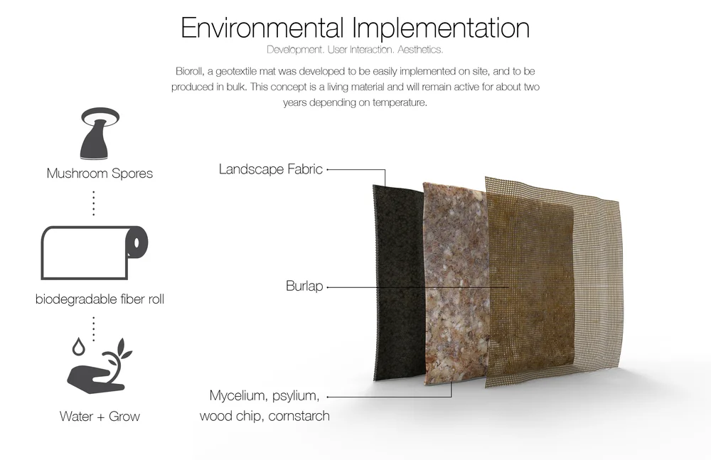 The mat, which the students created in the fall 2013 semester for the IID program’s annual 360° IID Competition, is made out of mushroom spores manufactured into a biodegradable fiber roll. The mat can be used on construction sites to prevent sediment runoff (required by law) and is a sustainable alternative to silt fencing, which is made from petroleum-based black plastic and discarded after a single use.